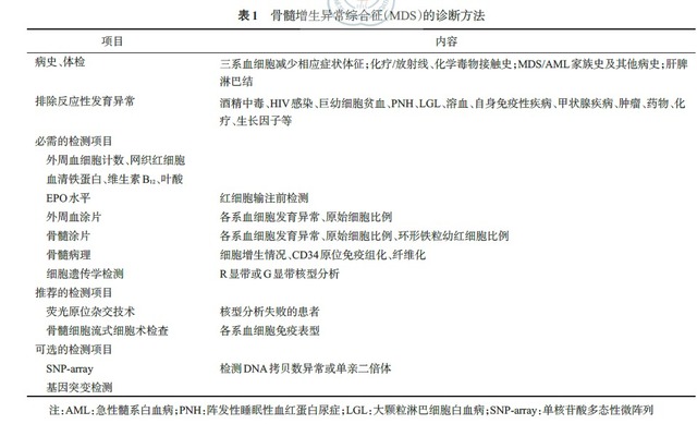 3.MDS 的诊断方法:MDS 诊断依赖于多种实验室检测技术的综合使用,其中骨髓细胞形态学和细胞遗传学检测技术是 MDS 诊断的核心。MDS 的主要诊断方法见表 1。