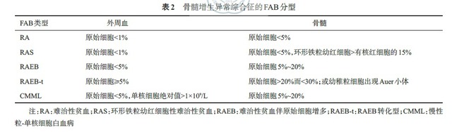 1.FAB 分型:1982 年 FAB 协作组提出以形态学为基础的 MDS 分型体系(表 2),主要根据 MDS 患者外周血和骨髓细胞发育异常的特征,特别是原始细胞比例、环形铁粒幼细胞比例、Auer 小体及外周血单核细胞数量,将 MDS 分为 5 型:难治性贫血 (refractory anemia,RA)、环形铁粒幼红细胞性难治性贫血(RA with ringed sideroblasts,RAS)、难治性贫血伴原始细胞增多 (RA with excess blasts,RAEB)、难治性贫血伴原始细胞增多转化型 (RAEB in transformation,RAEB-t)、慢性粒一单核细胞白血病 (chronic myelomonocytic leukemia,CMML)。