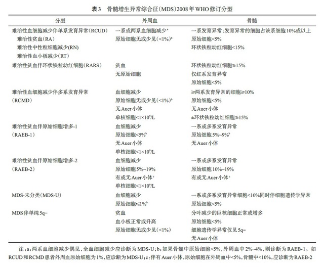 2.WHO (2008) 分型:1997 年 WHO 开始修订 MDS 的 FAB 分型方案。2008 年 WHO 推出了修订的 MDS 分型方案 (WH0 2008)(表 3)。目前,WH0 2008 分型已被广泛接受,MDS 患者均应按照 WH0 2008 分型方案进行诊断分类。