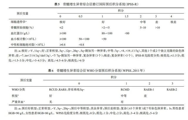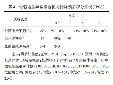 1.国际预后评分系统 (IPSS):IPSS 基于 FAB 分型,可评估患者的自然病程。危险度的分级根据以下 3 个因素确定:原始细胞百分比、血细胞减少的程度和骨髓的细胞遗传学特征(表 4)。