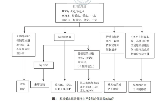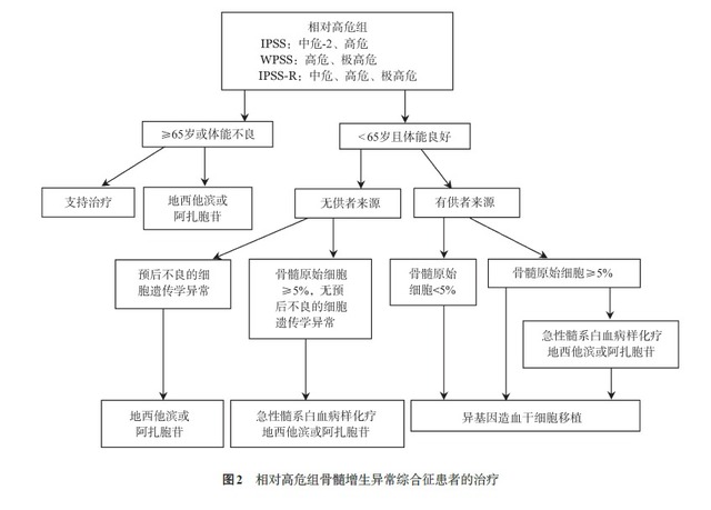 MDS 患者自然病程和预后的差异性很大,治疗宜个体化。应根据 MDS 患者的预后分组,同时结合患者年龄、体能状况、治疗依从性等进行综合分析,选择治疗方案。MDS 患者可按预后分组系统分为两组:相对低危组(IPSS- 低危组、中危 -1 组,IPSS-R- 极低危组、低危组和中危组,WPSS- 极低危组、低危组和中危组)和相对高危组(IPSS- 中危 -2 组、高危组,IPSS-R- 中危组、高危组和极高危组,WPSS- 高危组和极高危组)。