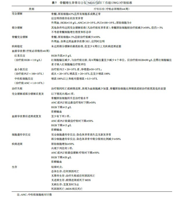 MDS 国际工作组 (International Working Group,IWG) 于 2000 年提出国际统一疗效标准,2006 年又进一步修订,使不同临床治疗方案结果间具有可比性。MDS 的治疗反应包括以下四种类型:改变疾病的自然病程、细胞遗传学反应、血液学改善和改善生存质量(表 7)。