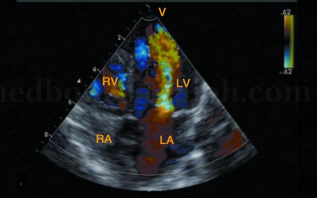 (1)舒张期二尖瓣口见中心形多色镶嵌的红色射流束(图2‐1‐123),严重者可呈火焰状。