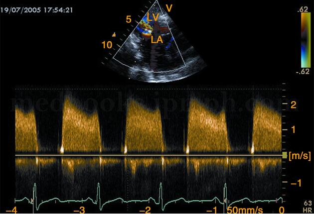 图2‐1‐124 脉冲多普勒显示舒张期二尖瓣狭窄射流频谱