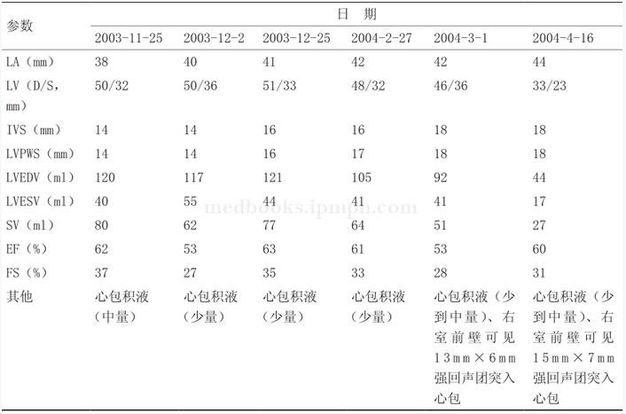 心脏彩超示:左室壁均匀性增厚(室间隔与左室后壁均为16mm),室壁运动协调。心包积液(少量)。