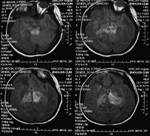 入院查体:强迫体位,神志清楚,躁动不安,呼吸急促。满月脸,贫血貌。四肢末梢、大腿内侧皮肤花斑,颈部胸前有10cm×10cm瘀斑。构音障碍,右侧鼻唇沟浅,软腭抬举度差,咽反射(+)。左侧肢体肌力4级,右侧肢体肌力3级,双手摸索、强握动作,双侧腹壁反射(+),双侧肱二头、三头肌腱、膝腱及跟腱反射对称(+++),双侧Hoffmann征(+),双侧Babinski征(-),Chaddock征(+)。颈软无抵抗,Kernig征(-)。2008年3月26日头颅MRI(图2.1‐1)左侧中脑、脑桥、丘脑弥漫性肿胀、脱髓鞘改变。