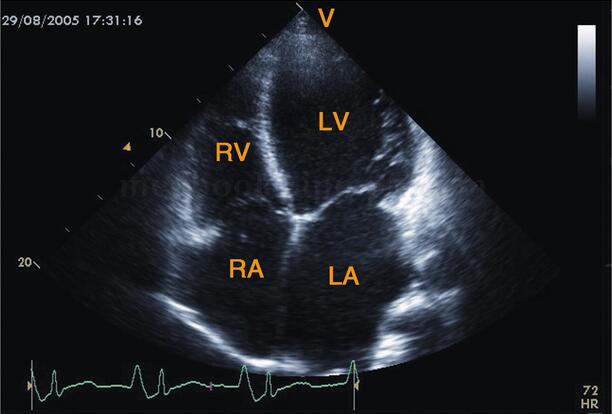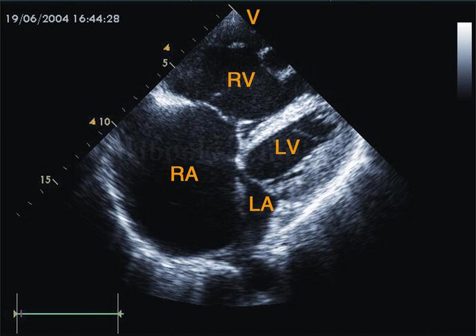 图2‐1‐182 心尖四腔心切面图心脏各心腔均扩大,以左室、左房扩大为著