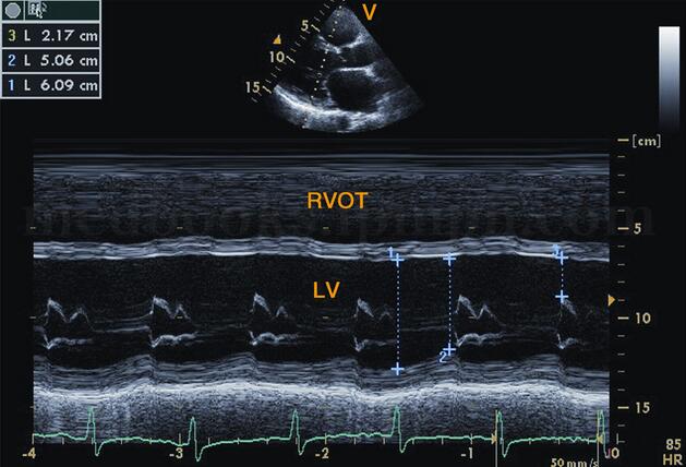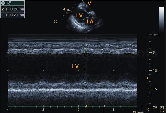 图2‐1‐183 二尖瓣口水平M型超声左室呈“大心腔,小瓣口”改变,E峰至室间隔距离明显增大