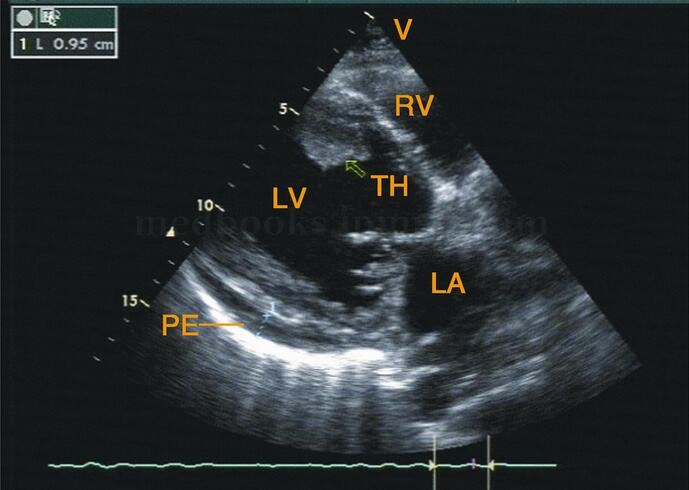 图2‐1‐185 左室长轴切面:室间隔靠近心尖部见一略强回声光团,中心回声略低;左室后壁后可见少量心包积液。TH:血栓
