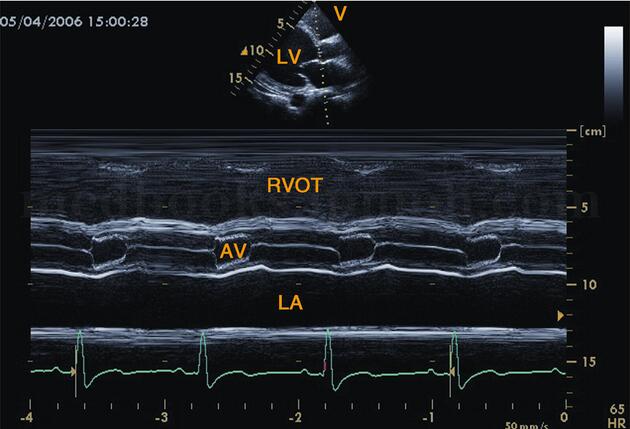 图2‐1‐187 心底波群M型超声主动脉根部振幅减低,瓣膜开放小,关闭速度减慢