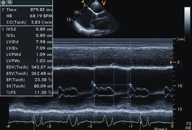 超声描述 全心扩大,以左心为主,左室舒张末期内径78.5mm;主动脉振幅减低,呈充盈不足表现;二尖瓣开放相对小,左室呈“大心腔,小瓣口”,E峰至室间隔距离(EPSS)增大为25﹒6cm;室壁运动弥漫性减弱,左室射血分数34.5%;二尖瓣口E峰明显大于A,呈限制性充盈,二、三尖瓣中度反流;少量心包积液。