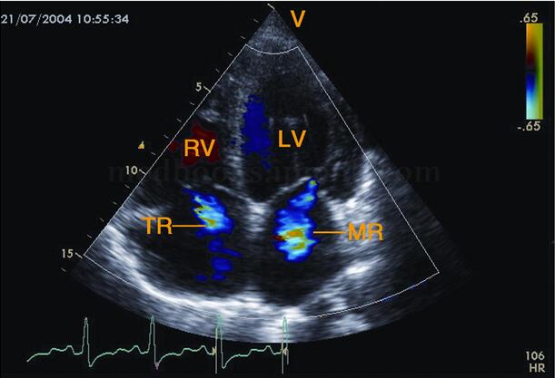 (2)合并多瓣膜反流,最常见于二、三尖瓣、肺动脉瓣(图2‐1‐189)。
