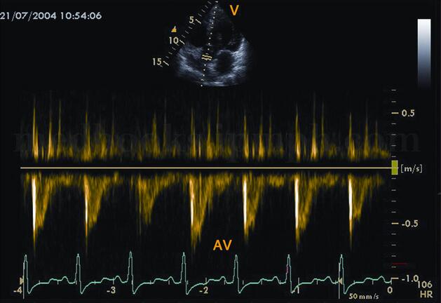 图2‐1‐191 二尖瓣口血流频谱:病变早期表现为A峰增高、E峰减低,E/A<1.0