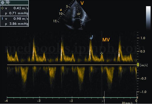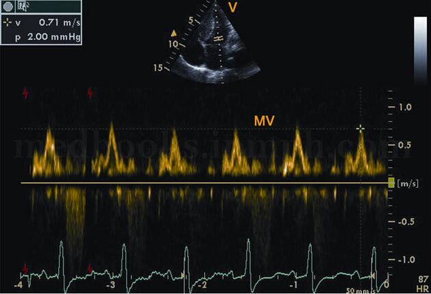 (2)二尖瓣口血流频谱异常的形态随疾病时期和程度不同,表现形式各异。①早期:A峰增高,E峰减低,E/A<1.0(图2‐1‐191)。②中期:呈“假性正常化”,二尖瓣E峰正常或稍增高,A峰减低,E/A>1.0(见图2‐1‐192)。DTI可以帮助鉴别这种“假性正常化”。③晚期:“限制性”充盈,E峰呈高耸的尖峰波,A峰极低或消失,E/A>1.5~2.0(图2‐1‐193)。