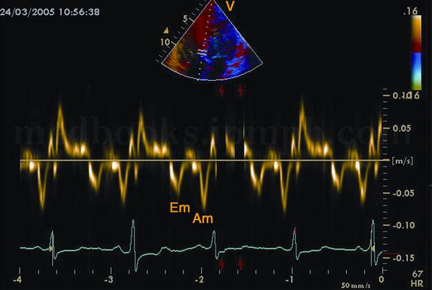 图2‐1‐195 组织多普勒成像扩张型心肌病患者二尖瓣环水平组织多普勒,Am>Em