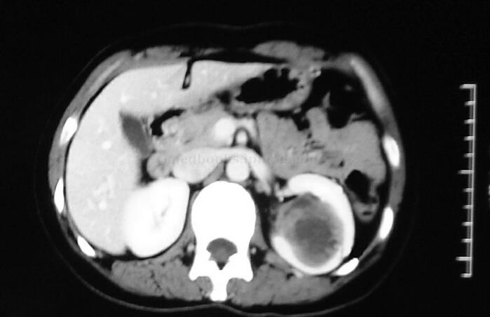 现病史:患者1周前无明显诱因出现左侧腰部疼痛,呈绞痛,伴恶心、呕吐,为胃内容物,无血尿,无尿频、尿急、尿痛,无腹胀、腹泻,自服索米痛片不能缓解。在家中休息一夜后症状缓解。外院CT检查示左肾占位,遂来我院。发病以来饮食、睡眠可,大小便正常,体重未见明显变化。