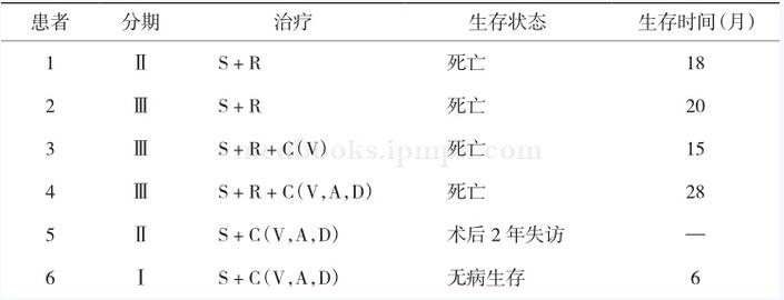 表 6例成人肾母细胞瘤患者的临床分期,治疗,生存状态及生存时间