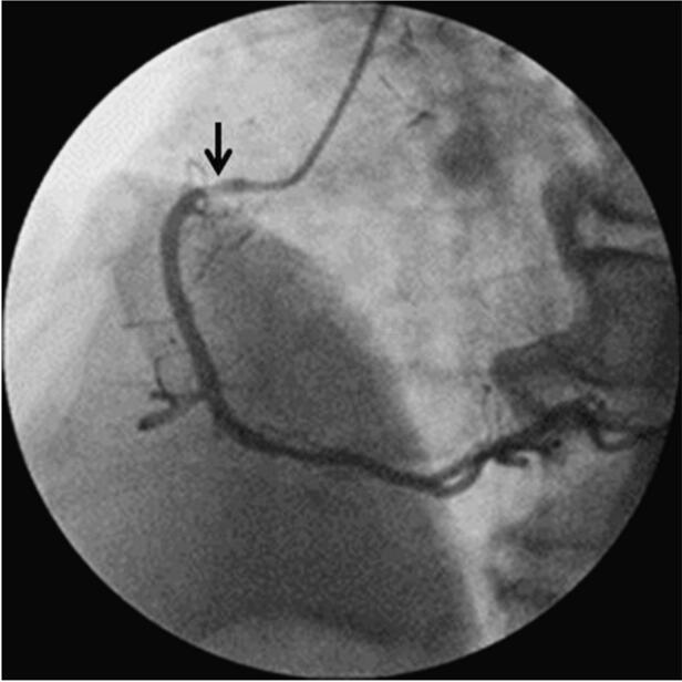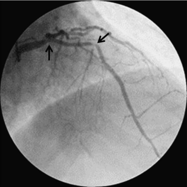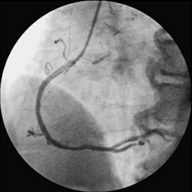1月30日冠脉造影示:左主干远段狭窄50%,LAD开口狭窄95%,中段狭窄90%,可见血栓影像;LCX开口狭窄40%,远段节段性狭窄80%;钝缘支近段狭窄70%;RCA开口狭窄70%。患者于1月31日转至胸心外科行左内乳动脉‐前降支旁路移植手术。于2月10日行RCA开口支架置入(图068‐1~图068‐5,病变处标以箭头)。