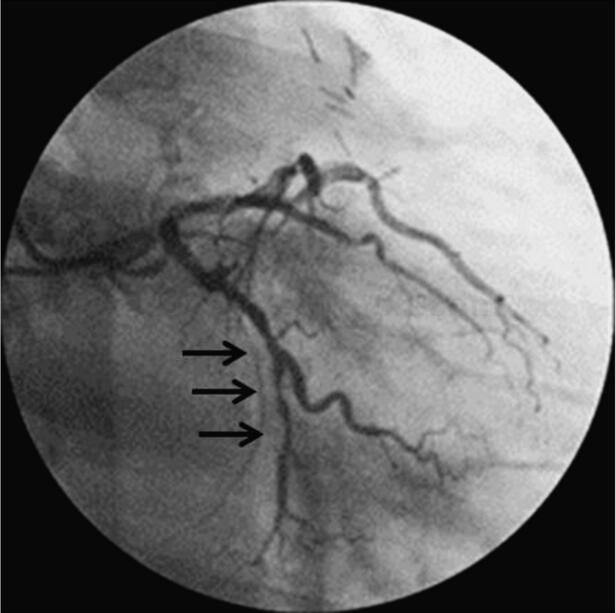 心电图:V2~V6导联病理性Q波,ST段弓背向上抬高3mm,T波倒置。心脏彩超:左室肥厚,左室前壁节段性活动异常,升主动脉增宽伴轻中度主动脉瓣关闭不全,轻度二尖瓣关闭不全,左室舒张功能减退,L VEF:55%。HbA1c:4.7%,AL T:44U/L,sCr:63μmol/L,TC:5.61mmol/L,LDL‐C:3.83mmol/L,TG:2.71mmol/L,CK:477U/L,CK‐MB:56U/L,肌钙蛋白(─),pro‐NTBNP:112.3pg/ml。