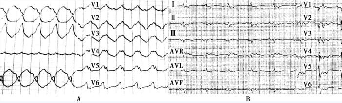 A:此次发病,复律前心电图,室性心动过速呈右束支传导阻滞图形,提示室性心动过速起源于左心室;B:4年前患者因心房扑动行射频消融术后复查心电图,胸导联QRS波可见典型棘波(Epsilon波),伴右胸导联T波倒置