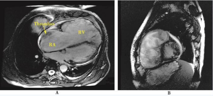 A:横断面显示右心房、右心室显著扩大,右心房可见附壁血栓形成; B:矢状面显示右心增大,其内可见血流淤滞的涡流信号