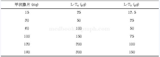 甲状腺激素替代治疗的常用甲状腺制剂有L‐T4钠片、甲状腺片和L‐型三碘甲腺原氨酸(L‐T3)。3种甲状腺制剂的剂量对等关系见表2‐1。