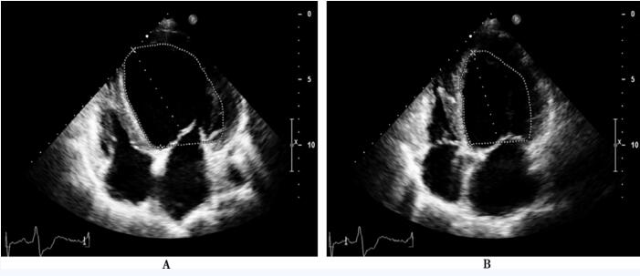 A:左心室舒张末期;B:左心室收缩末期,Simpson法测量左心室射血分数44%