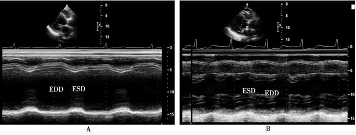 A:术前,M型超声心动图显示左心室舒张末期(83mm)、收缩末期内径(67mm)明显扩大; B:术后3个月,M型超声心动图显示左心室舒张末期内径(67.8mm)、收缩末期内径(57mm)增大,但较术前明显减小。ESD:收缩末期内径;EDD:舒张末期内径