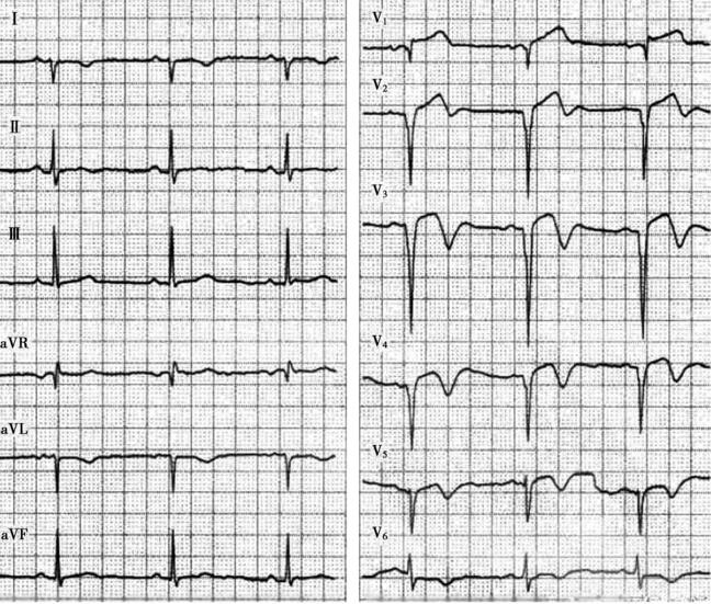 窦性心律,V2~V4 ST段抬高,提示急性前壁心肌梗死(图1-1) ;