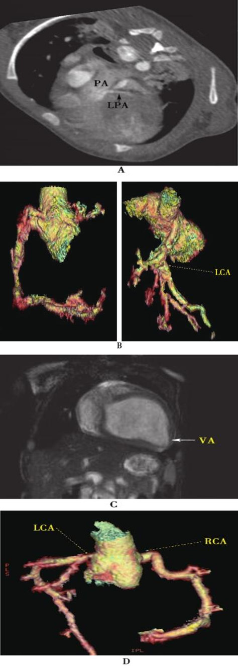 A:术前,提示左冠状动脉自肺动脉左侧壁发出;B:术前,三维重建显示左冠状动脉发自肺动脉、右冠状动脉发自主动脉;C:术前,提示心尖室壁瘤形成;D:术后,三维重建显示左、右冠状动脉均发自主动脉。PA:肺动脉;LCA:左冠状动脉;RCA:右冠状动脉;VA:室壁瘤