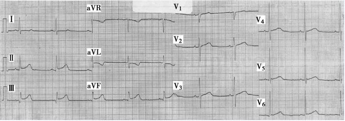 图5‐32‐1 急诊心电图:窦性心律Ⅱ、Ⅲ、aVF导联ST段抬高1.5mV