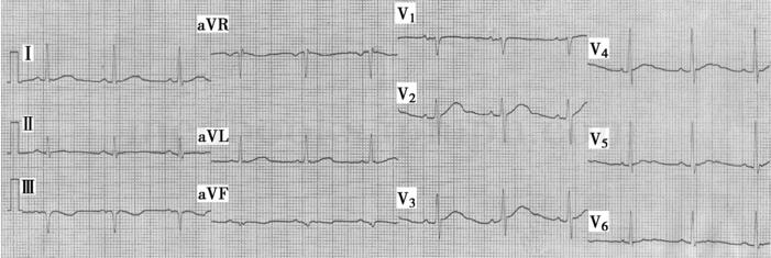 急诊血常规、凝血功能、肝肾功能、电解质、血淀粉酶无异常。肌钙蛋白T<0.03ng/ml,NT‐proBNP<60pg/ml。生化:TC5.14mmol/L,TG3.23mmol/L,LDL3.41mmol/L,HDL 0﹒9mmol/L。住院后查CK‐MB68.2U/L,糖化血红蛋白6.4%,肌钙蛋白T>2ng/mL。心脏彩超提示LAD33mm,LVDd42mm,EF 70%,各心腔大小及心内结构未见异常,左心室舒张功能减退,收缩功能正常。心电图检查见图5‐32‐1和图5‐32‐2。