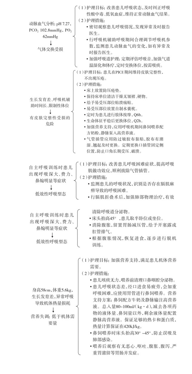 2.护理评估 患儿行主动脉缩窄矫治+室间隔缺损修补术,手术操作复杂,损伤膈神经造成左侧膈肌麻痹,从而导致呼吸机依赖,脱机后出现严重呼吸困难。