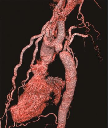 图33-1 主动脉CTA三维重建 主动脉弓离断位置位于左锁骨下降主动脉处,可见多发侧支循环形成