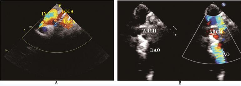 图33-2 超声心动图 A:彩色多普勒超声心动图示头臂干、左颈总及左锁骨下动脉高速花彩血流信号;B:二维、彩色多普勒超声心动图示主动脉弓及降主动脉回声中断。INA:无名动脉;LCCA:左颈总动脉;LSCA:左锁骨下动脉;ARCH:主动脉弓;DAO:降主动脉
