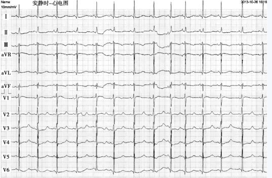心肌酶学:CK 1600U/L,CK-MB 59.5U/L,肌钙蛋白I 0.76ng/ml。心电图:窦性心律;频发房性期前收缩;Ⅰ、a VL、V 4~V 6导联ST段压低0.05~0.1m V, T波低平 (图95-1)。动态心电图:窦性心律;阵发房颤伴快速心室反应,伴室内差异性传导;室性期前收缩3次/24小时,房性期前收缩16 868次/24小时,短阵房速6次/24小时;冠状动脉供血不足。超声心动图:各心腔大小、室壁运动幅度正常,左室假腱索,左室舒张功能下降,左室收缩功能正常。