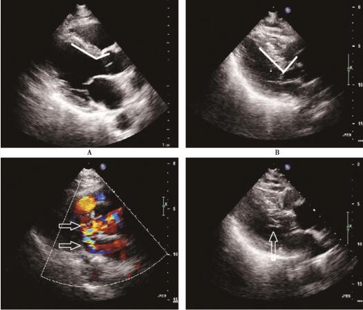 图95-2 超声心动图胸骨旁在心室长轴切面图像 A:正常人左心室流出道室间隔与主动脉夹角呈钝角;B:本例该患者左心室流出道室间隔与主动脉夹角变小呈近似直角;C:本例患者左心室流出道收缩期快速血流与二尖瓣前叶收缩期前向运动,引起二尖瓣反流共同构成特征性分叉血流;D:二尖瓣前叶腱索收缩期前向运动