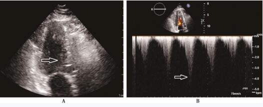 图95-3 二维超声心动图心尖两腔切面、在心室流出道血流频谱 A:心尖两腔切面示室间隔基底部略增厚,突向左室流出道 (箭头所示);B:左心室流出道峰值血流速度达4m/s,左心室流出道压力阶差64mm Hg
