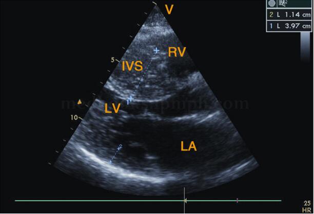 (2)主要超声表现为:室间隔与左室后壁增厚,一般为向心性对称性,偶有轻度非对称性,但室间隔厚度/左室后壁厚度<1.3。