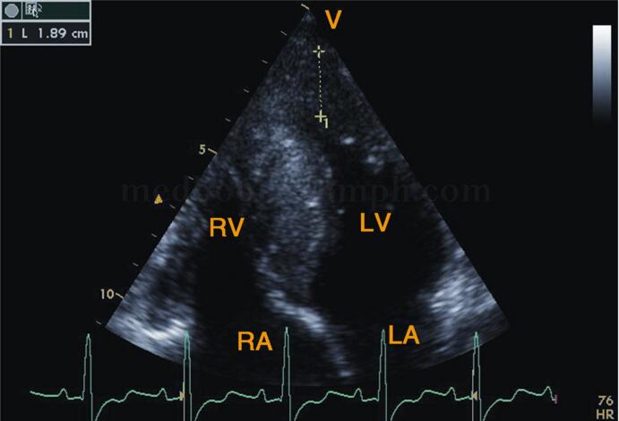 图2‐1‐200 心尖四腔心切面心尖部心肌明显增厚,心腔明显狭小,呈“核桃”状