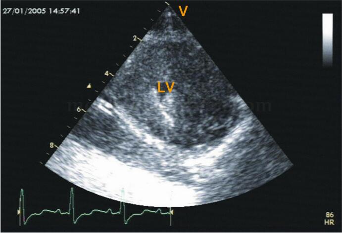 图2‐1‐201 左室短轴心尖水平切面心尖部心肌明显增厚致心腔近乎闭塞