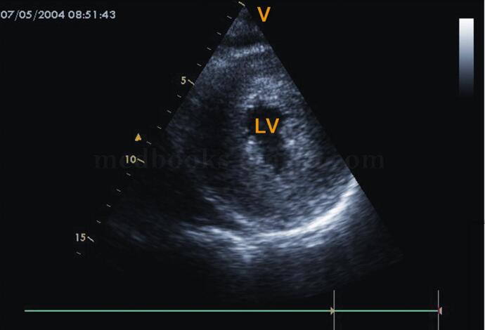 (3)左室乳头肌水平短轴切面:前外乳头肌及后内乳头肌增厚,位置前移(图2‐1‐199)。