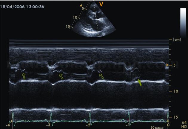 图2‐1‐197 二尖瓣波群M型超声左室流出道梗阻时二尖瓣C‐D段收缩期前向运动,呈多层弓背样隆起,即SAM现象