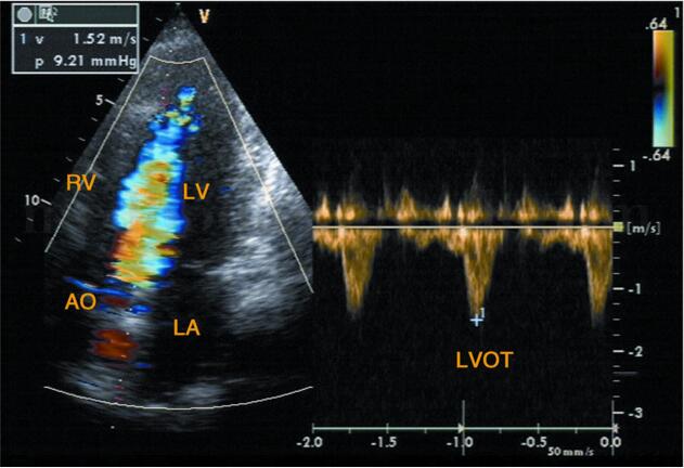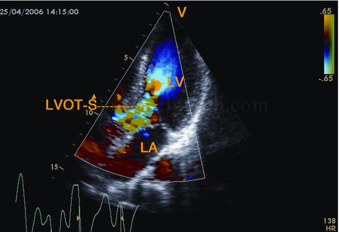 图2‐1‐207 左室流出道梗阻者,收缩早期流出道内见五色镶嵌细窄射流束