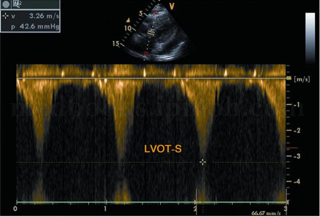 图2‐1‐210 左室流出道梗阻时频谱为收缩期负向高速 射流,呈“匕首”样