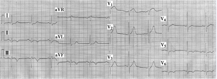 图5‐31‐1 心电图Ⅱ、Ⅲ、aVF导联QS型伴ST段抬高,T波倒置,V5~V6导联T波倒置