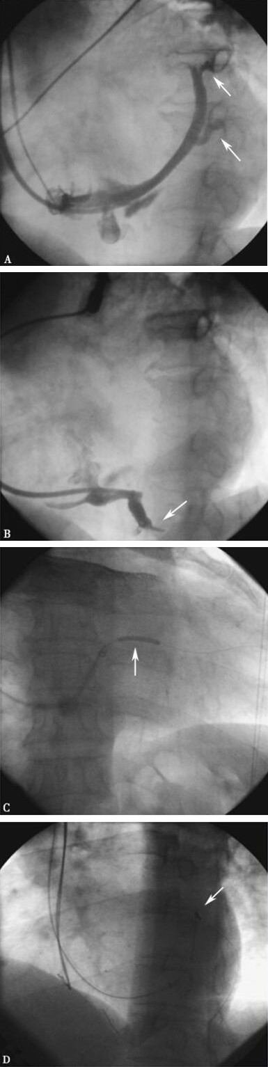 A:心侧静脉细小、心后侧静脉开口狭窄弯曲;B:心中静脉弯曲;C:球囊扩张心后侧静脉;D:球囊扩张后推送左室电极(1056,ST. Jude Medical),仍不能送入血管远端