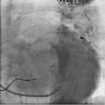 进行第2次手术的依据:①患者在术后第3年心力衰竭加重,考虑与左室电极不起搏有关;②患者坚决否定再次心外膜植入左室电极导线的方案;③复习静脉造影片子发现心后侧静脉虽然弯曲,但PTCA导丝可以通过,将1056型(头端为1.67mm,体段为1.86mm,ST. Jude Medical)左室电极换成4193型(头端1.78mm,体段为1.33mm,Medtronic)有成功的希望。在告知患者仍可能有手术不成功的基础上,患者同意再次尝试经静脉植入左室电极,再次签署知情同意书后,于8月5日再次经静脉植入左室电极导线。术中经心脏静脉造影,首先拟把PTCA导丝送至心后侧静脉远端,但反复操作均未成功。尝试从心中静脉送入PTCA导丝成功,并将导丝通过与心后侧静脉的交通送至冠状窦内,沿导丝送入4193电极至心后侧静脉,固定电极在起搏参数最佳的位置(图3-4-16)。术后5天患者出院。