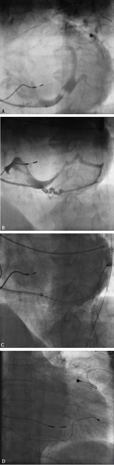 A:心中静脉送入PTCA导丝;B:造影显示心后侧静脉与心中静脉形成交通;C:左前斜45°,PTCA导丝从心中静脉逆向送入心后侧静脉,左室电极(4193,Medronic)通过极度弯曲处;D:后前位影像,PTCA导丝从心中静脉逆向送入心后侧静脉,左室电极通过极度弯曲处