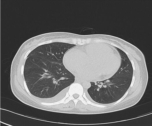 患者,女性,32岁。因“反复咳嗽、气喘6个月,加重1天”为主诉于2010年10月1日10时40分步行入院。入院前6个月开始出现阵发性咳嗽、咳痰,痰为黄黏痰,量少,不易咳出,伴气促,活动后明显,曾多次就诊于医院,考虑支气管炎,予药物治疗(具体不详),仍反复咳嗽、气促,夜间及活动后明显,油漆、汽油等气味亦可诱发咳嗽、气喘。入院前1个月余就诊某医院,行肺功能检查示通气功能混合型减退,以阻塞性为主(轻度),伴小气道中度损害。药物舒张试验阳性,FEV1改善量>200ml,改善率达到12%。予布地奈德吸入,效果不佳。入院前1天患者出现咳嗽、气喘较前加重,夜间不能平卧,遂转诊,行胸片检查示两中下肺阴影,考虑炎症。予治疗后(具体不详)症状稍好转,转诊笔者医院,为进一步诊治,门诊拟“咳嗽、气促待查”收住入院。病程中食欲稍减退,二便正常。